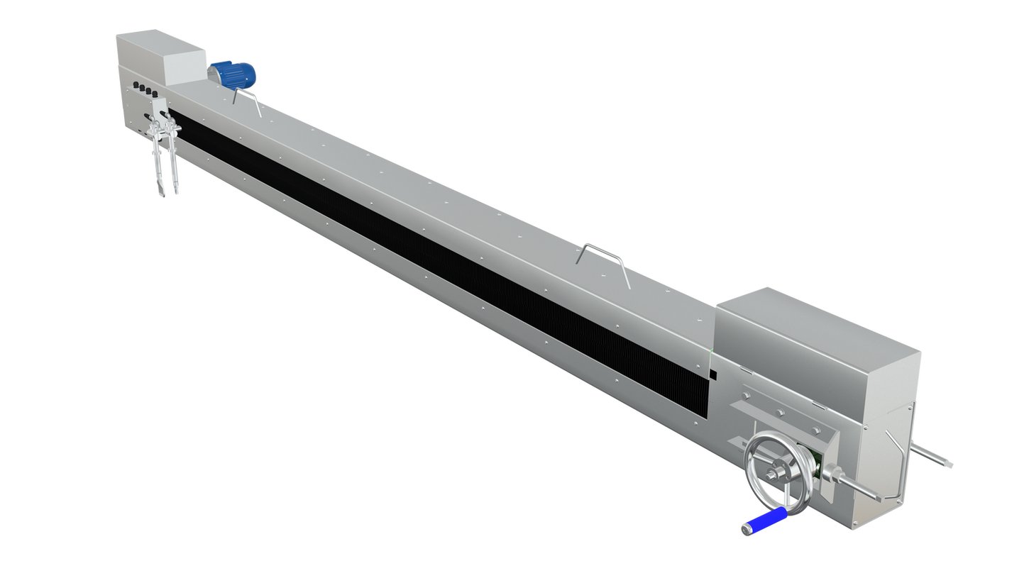 Seu sistema de movimentação por correntes e engrenagens 100% inox, combinado com trilhos em Teflon, entrega deslocamento suave, preciso e totalmente livre de lubrificação.