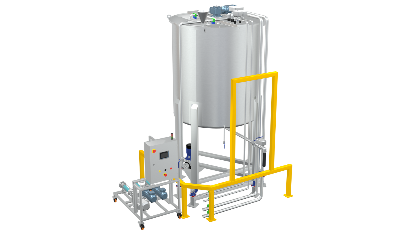 Conta com tanque de preparo vertical em aço inoxidável, sistema de agitação de alto rendimento e automação completa para adição de água e corante. Um dos diferenciais do equipamento é o sistema de pesagem com célula de carga, que permite controle gravimétrico da dosagem e correção automática de desvios durante o processo.